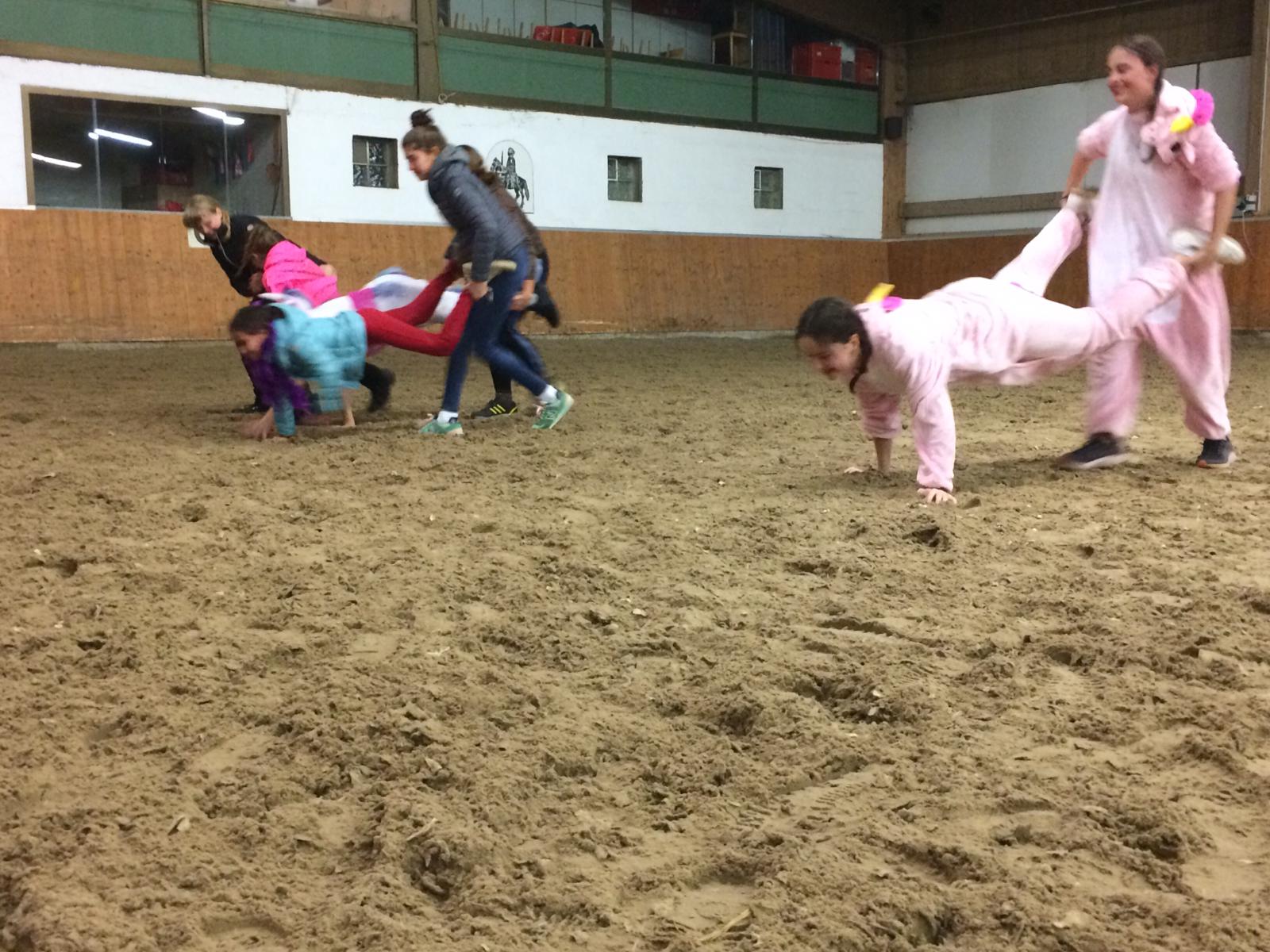 Durch viele Ballons, Luftschlangen und andere Karneval-Dekorationen war das Stübchen fast nicht mehr wieder zu erkennen. Genauso wenig wie die Gäste, die alle verkleidet kamen: Einhörner, ein Robin Hood, eine Sonnenblume und viele andere Verkleidungen ließen den Abend noch bunter werden. Bei verrückten und vor allem witzigen Spielen in der Reithalle konnten alle ein bisschen Energie ablassen, denn mit aneinandergebundenen Beinen zu zweit einen Parcours zu absolvieren ist anstrengender als es klingt. Als Belohnung fielen alle hungrig über das mitgebrachte Buffet her. Satt und erschöpft beendeten wir den Abend mit einer gemütlichen Runde Werwolf im Reiterstübchen. Nach und nach trudelten die Eltern ein, um ihre Kinder abzuholen und freuten sich über die vielen glücklichen Gesichter. Vielen Dank an alle die dabei waren, wir hatten sehr viel Spaß zusammen!